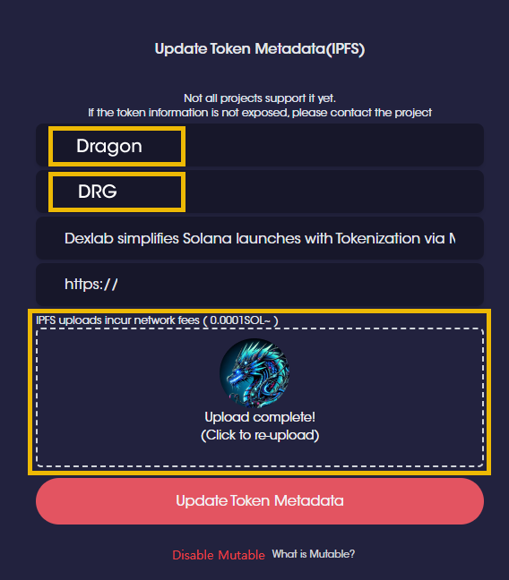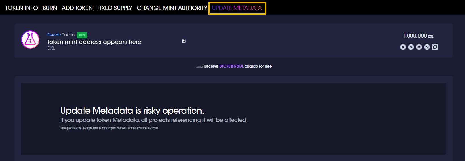 * After changing, click the 'Update Token Metadata' and wait for approval on the wallet