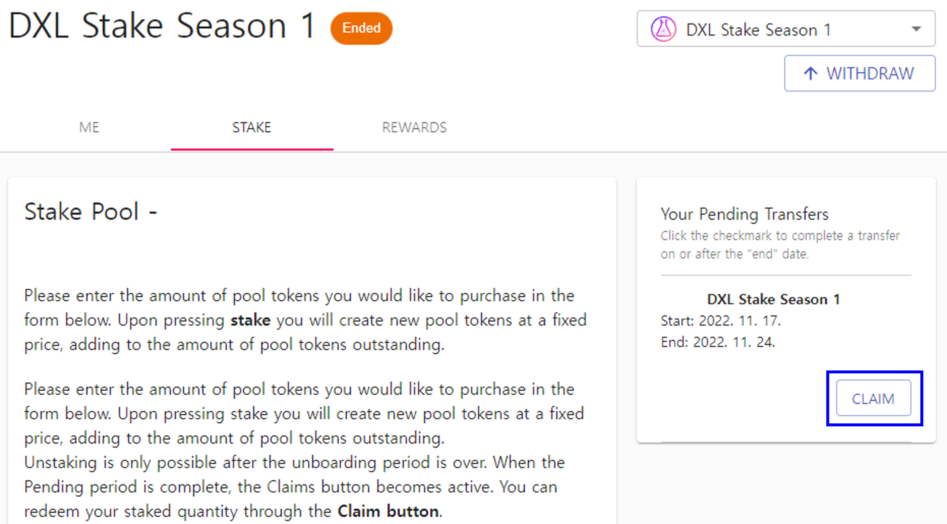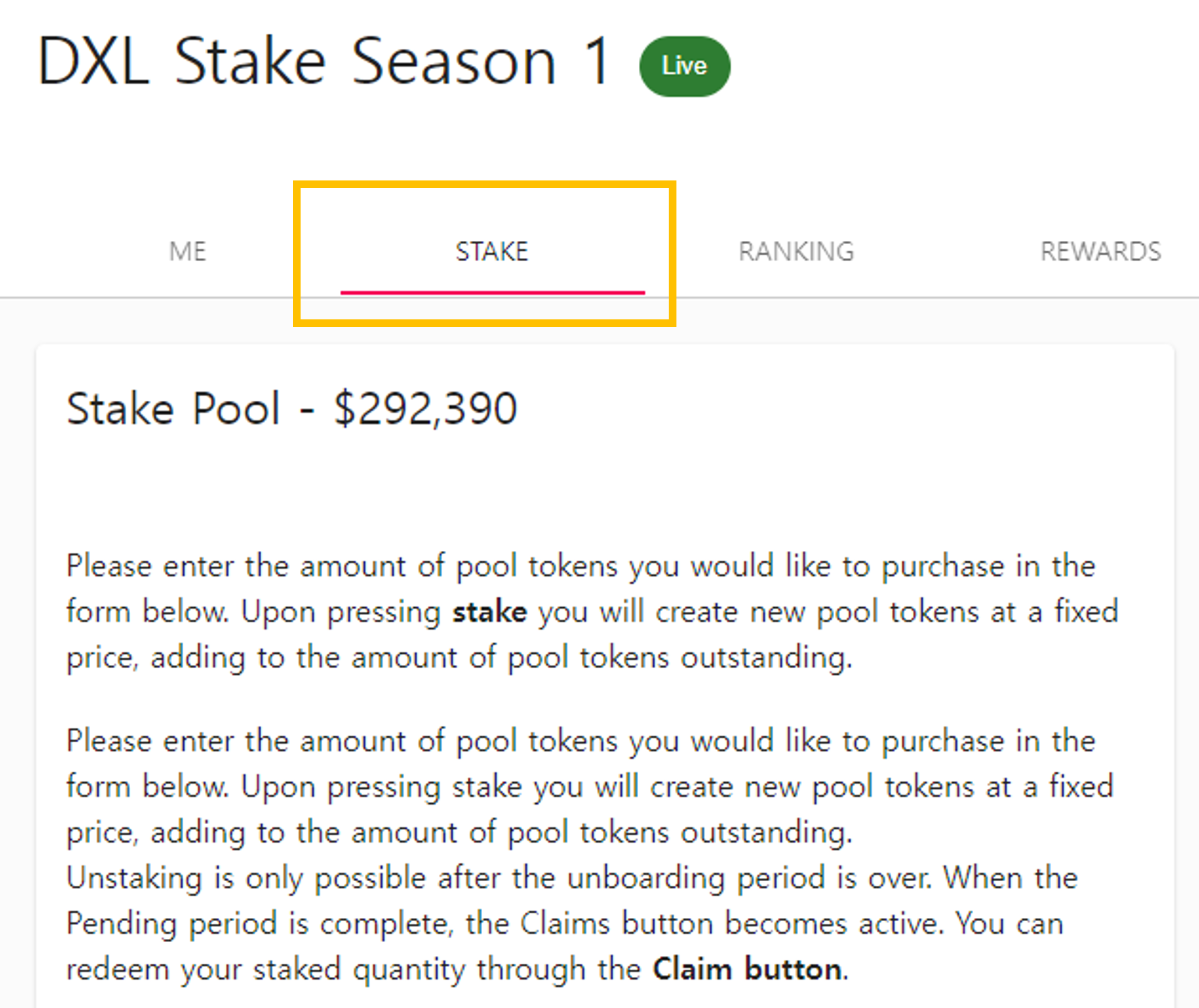 * Click the 'STAKE' tab and click the 'CLAIM' button on the side to get your unstaked DXL tokens.