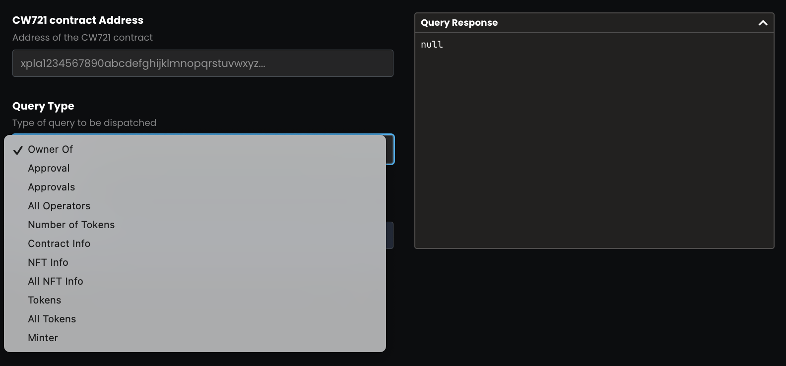 **Number of Tokens**, **Contract Info**, **All Tokens**, and **Minter** queries do not require additional parameters other than the CW721 contract address. Required parameters for other queries are shown below.
